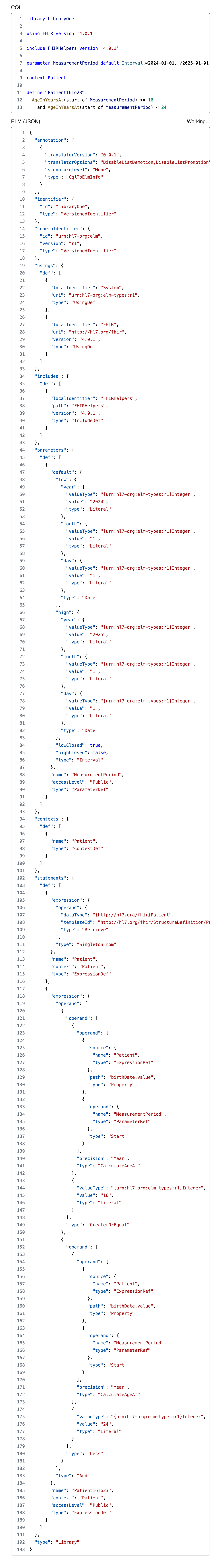 The interactive demo below uses the JavaScript version of the CQL-to-ELM translator and runs entirely on the client. You can type the CQL code and see the equivalent ELM JSON generated in real time.