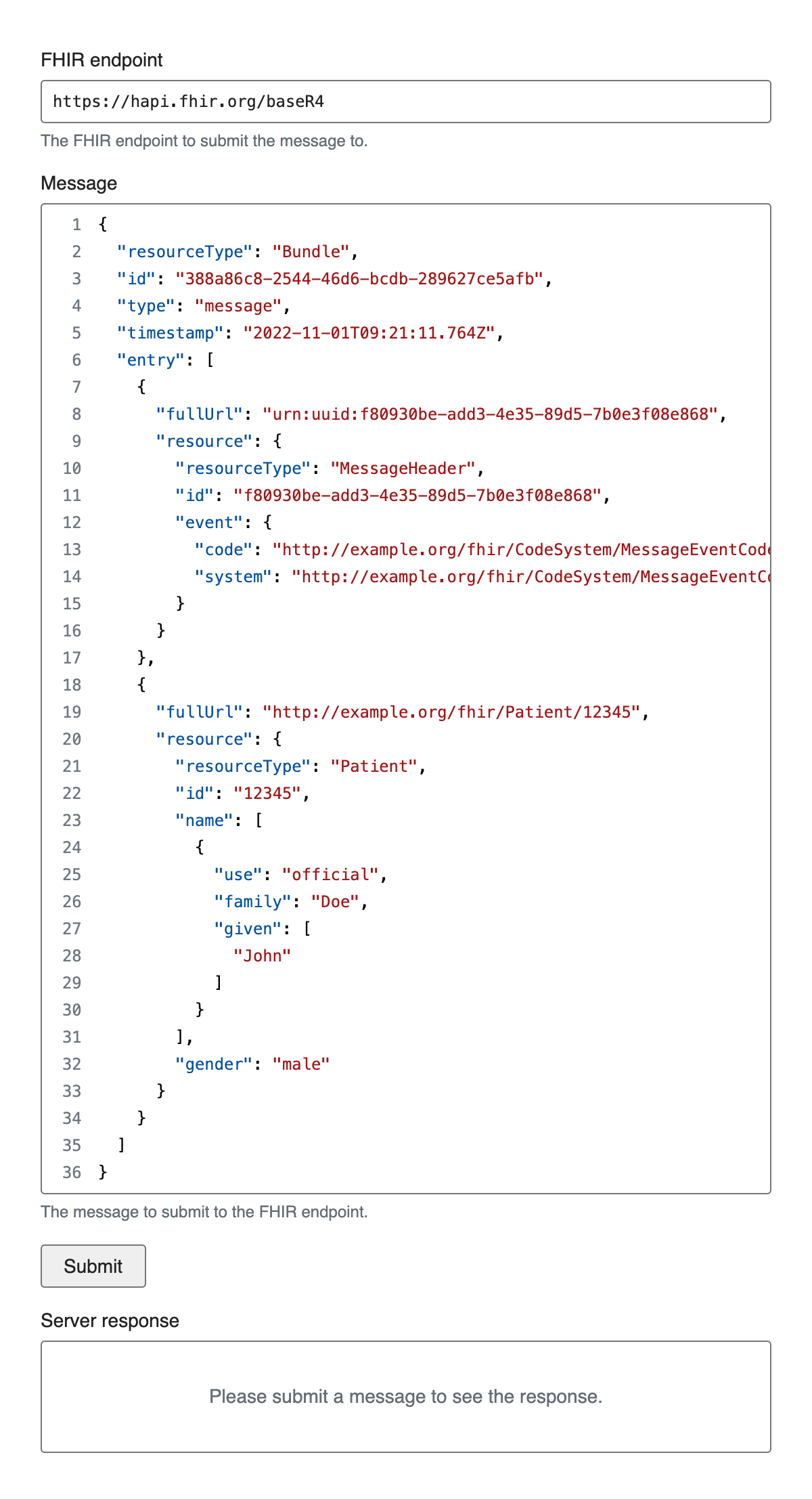 This tool allows you to easily submit JSON messages to FHIR servers and view the responses.