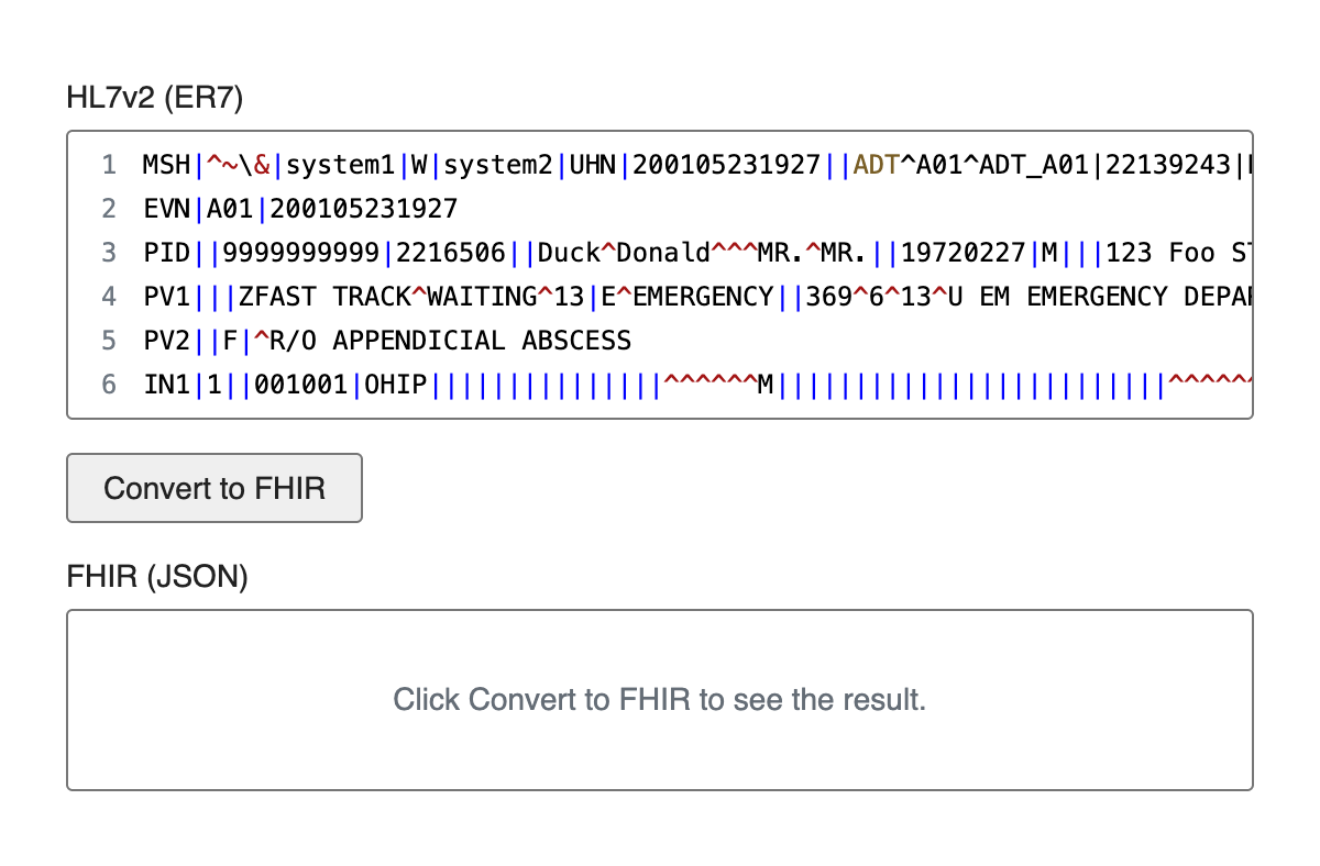 The tool converts HL7v2 messages to FHIR using the LinuxForHealth HL7 to FHIR Converter.