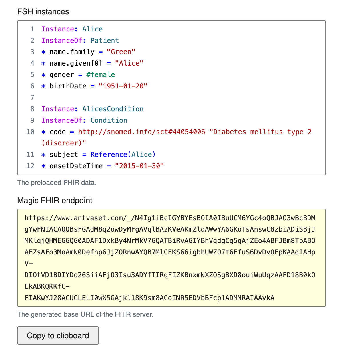 Since the data and configuration are stored in the URL itself (similar to how data URIs encapsulate their content), every individual URL corresponds to an immutable (read-only) FHIR server that's been seeded with the data from the URL.